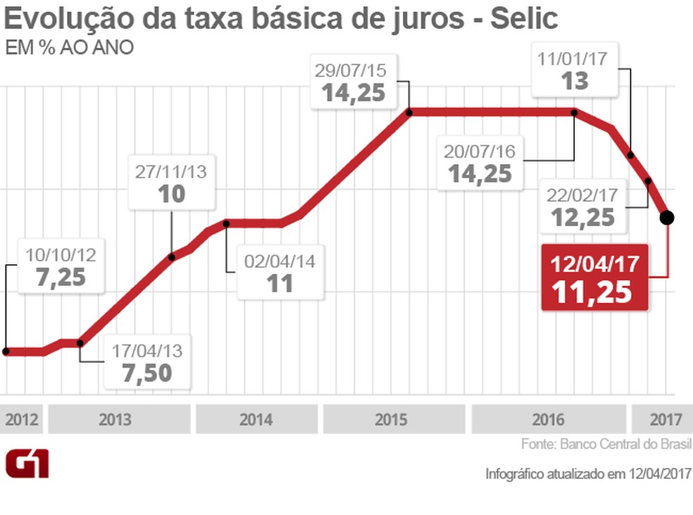 Taxa de juros básica da economia caiu em um ponto percentual, de 12,25% para 11,25% ao ano. (Foto: Arte G1)
