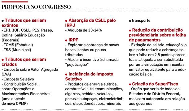 O projeto prevê a extinção de sete tributos federais (IPI, IOF, CSLL, PIS, Pasep, Cofins e salário-educação), do ICMS (estadual) e do ISS (municipal). Em troca, seriam criados outros três: o Imposto sobre Valor Agregado (IVA), o Imposto Seletivo e a Contribuição Social sobre Operações e Movimentações Financeiras. Esse último seria uma espécie de CPMF. A nova contribuição seria usada para permitir a redução das alíquotas da contribuição previdenciária paga pelas empresas e trabalhadores. Remédios e alimentos teriam tributação reduzida.